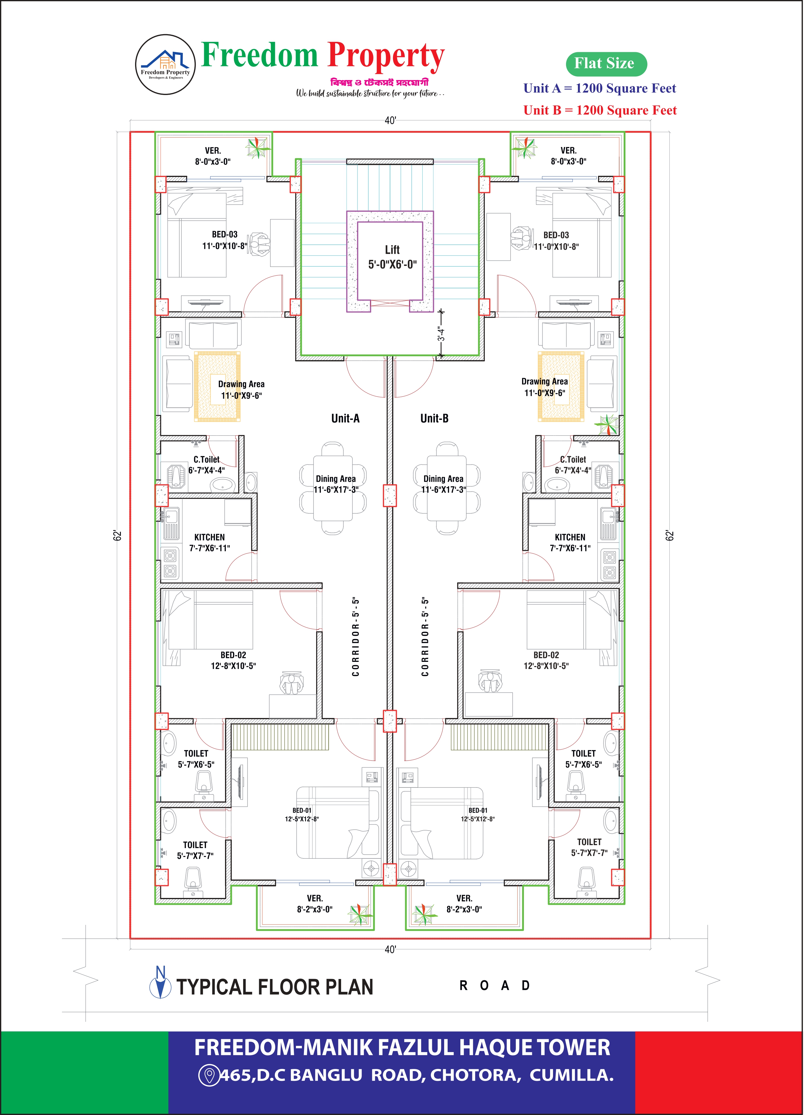 Developer: The project plan features the distinct Freedom Property logo with taglines in both Bengali and English, highlighting its focus on sustainable, high-quality development for local and foreign property buyers. A color-coded table (Green for Unit A, Red for Unit B) explicitly defines the exact flat size for each of the two units as 1200 Square Feet.